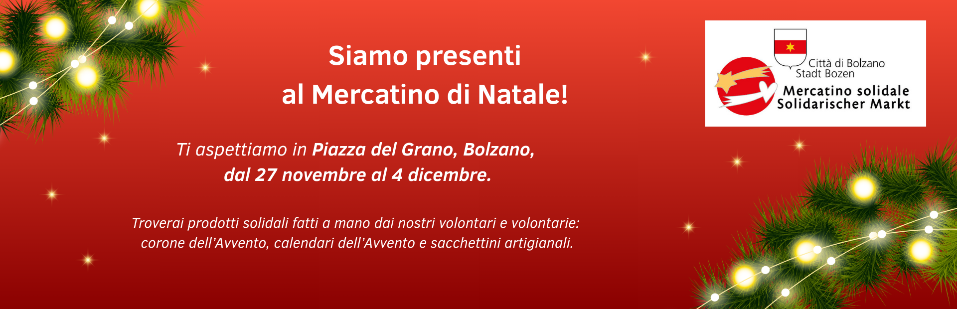Dal 27 novembre al 4 dicembre ci trovate in Piazza del Grano a Bolzano con i nostri prodotti solidali fatti a mano: corone dell’Avvento, calendari